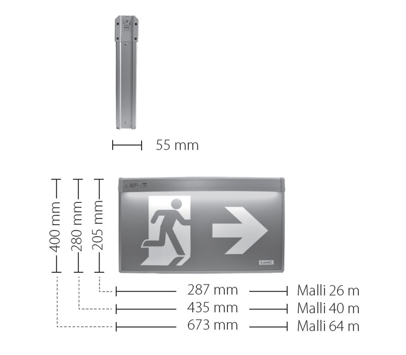 Tyylikäs ja tukeva opastevalaisin, jonka kotelointiluokka on IP44 ja josta on saatavilla kolme havaintoetäisyyttä: 26 m, 40 m ja 64 m. Runko on luonnonanodisoitua alumiiniprofiilia ja kulmaprofiilit alumiininväristä muovia. Mukana kiinnikkeet katto- ja seinäasennukseen. Havaintoetäisyydeltään 64 m:n valaisin voidaan asentaa myös lippukannakkeeseen (lisävaruste). Sama runko sopii sekä yksi- että kaksipuolisiin opasteisiin. Rungon alareunassa on raot, joista valo levittyy miellyttävästi, mikä luo tasaisen valaistuksen valaisimen alapuolelle. Valonlähde: LED.